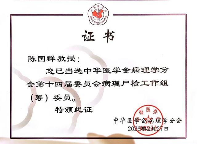 在全国病理学会换届选举工作中,陈国群凭借扎实的专业功底、丰富的临床经验与突出的行业影响力,当选中华医学会病理学分会尸检学组委员。
