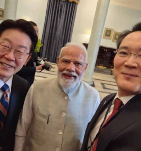 三星集团会长李在镕使用印度制造的三星手机,与韩国总统李在明和印度总理莫迪自拍。