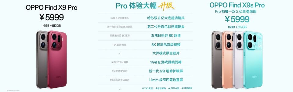 刘作虎在发布会上公布价格时表示,相比Find X9 Pro,在影像、设计、屏幕、性能到体验都巨大升级的Find X9s Pro,起售价与上代持平不涨价,同为5299元,主力销售的16+512版本则为5999元。